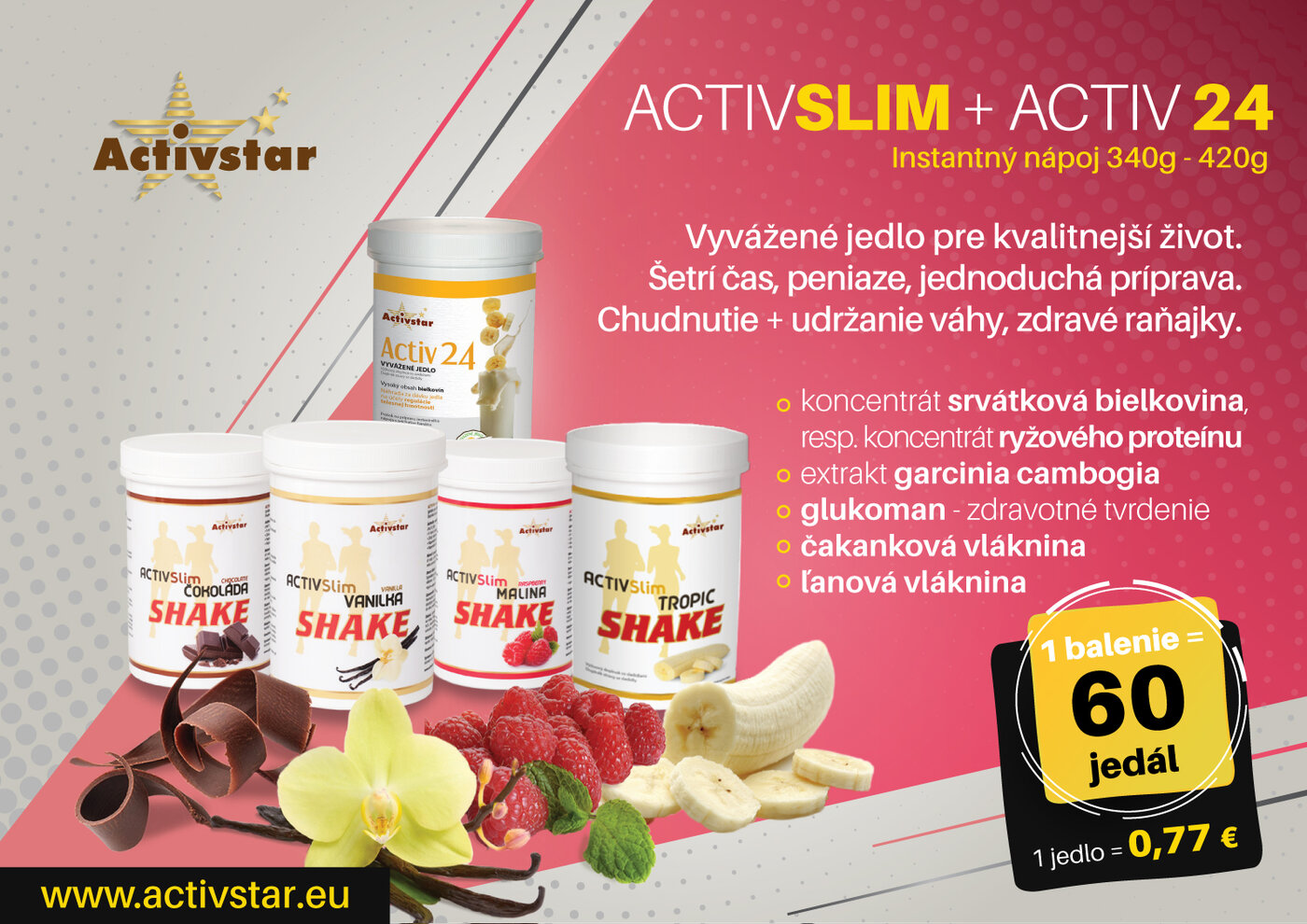 Použitie : Zdravé a vyvážené jedlo. Ak nahradíš 1 jedlo vyváženým koktejlom Activstar, získaš komplet výživu.
