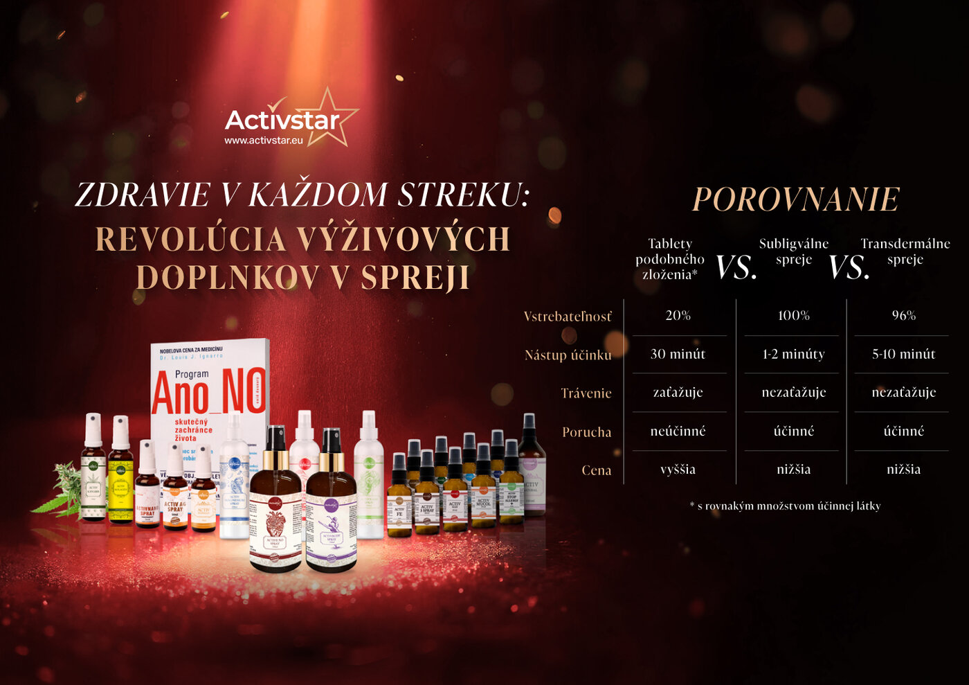 Firma Activstar má vo svojom produktovom portfóliu spreje vyrobené špeciálnou technológiou, čo prispieva k lepšej vstrebateľnosti a účinnosti aktívnych zložiek.